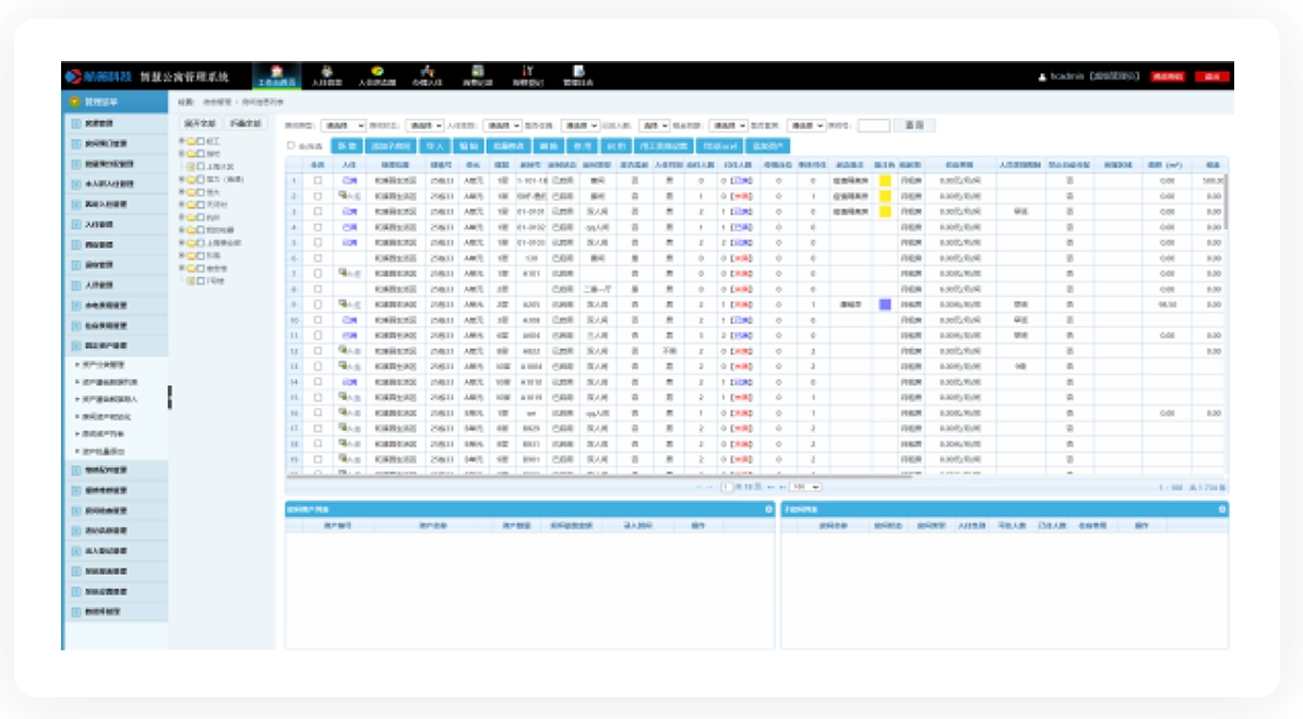 宿舍信息可视化,支持图形化展示房源信息,可按区域、楼栋、楼层进行展开,查看房间、床位的分布情况,管理员可查看宿舍的入住情况等,并可在此实现快捷业务办理(入住、调宿、退宿等)。